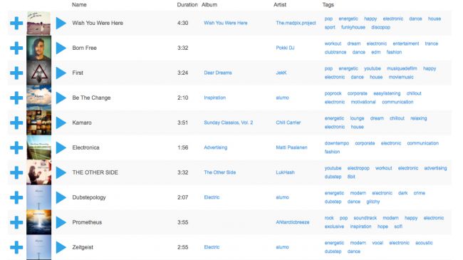 На странице много рекламы, а также странные куски текста о привычках Моцарта и Марка Твена, но нас интересует список тем и жанров над окном поиска. Выберите то, что подходит для вашего видео, затем прокрутите вниз, чтобы увидеть обширный список треков. Нажмите на значок воспроизведения рядом с треком, чтобы просмотреть его, затем нажмите значок плюса, когда найдете подходящий. Музыка будет добавлена в ваш проект и обрезана в соответствии с длительностью видео. Это не заменяет существующую аудио дорожку на видео видео, а добавляет новую сверху.
